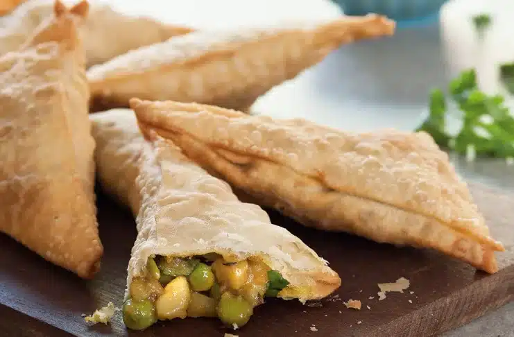Llevar un extremo del triángulo hacia el centro, y luego el otro por encima, formando un cono. Sellar con agua. Rellenar el interior del cono con una cucharada del relleno y cerrar bien con el otro extremo, formando la empanadita en forma de triángulo.