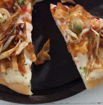 Precocinar en el horno fuerte. Retirar, poner a gusto más salsa, y cubrir con la mozzarella rallada, las cebollas y la panceta doradas.