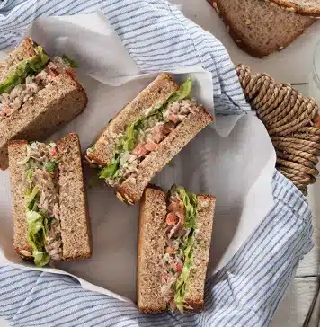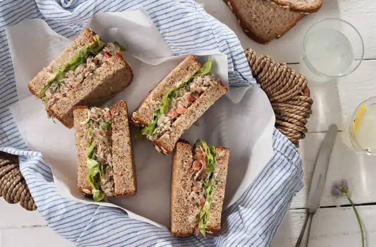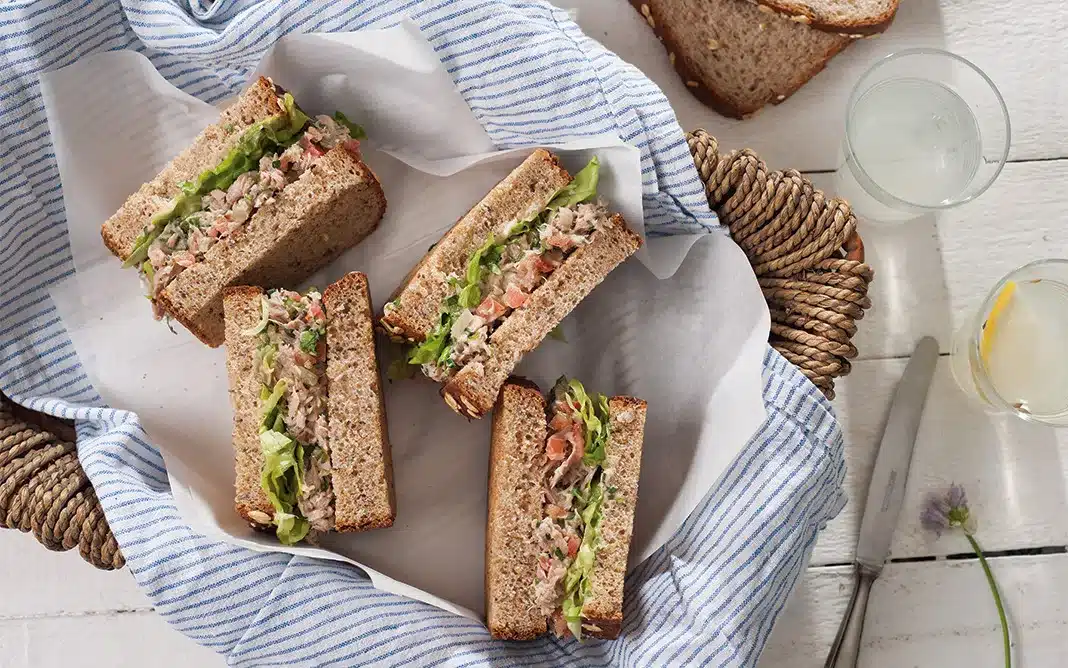 Cortar la lechuga bien finita y poner sobre una rebanada de pan, arriba el relleno de atún y terminar con otra tapa.