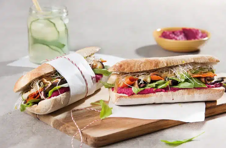Rellenar con los vegetales asados, la rúcula limpia y brotes.