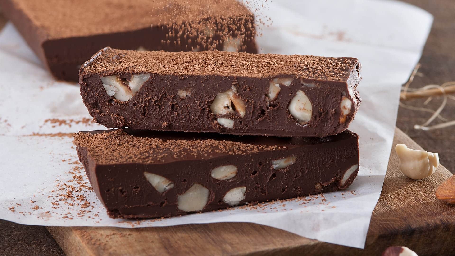 Preparar un molde rectangular de 25 cm por 10 cm aproximadamente (puede ser uno de budín) forrándolo con papel manteca enmantecado y espolvoreado con cacao amargo.