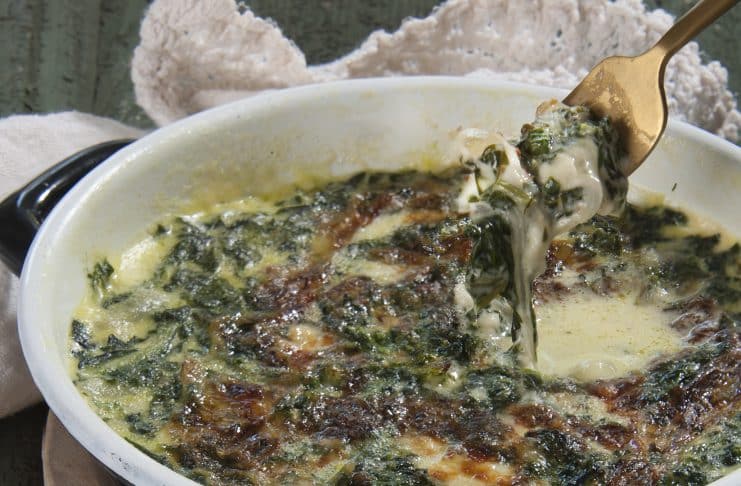 Colocar una base de salsa en una fuente para horno, poner las espinacas y cubrir con el resto de la salsa y mรกs queso rallado.
