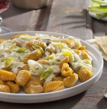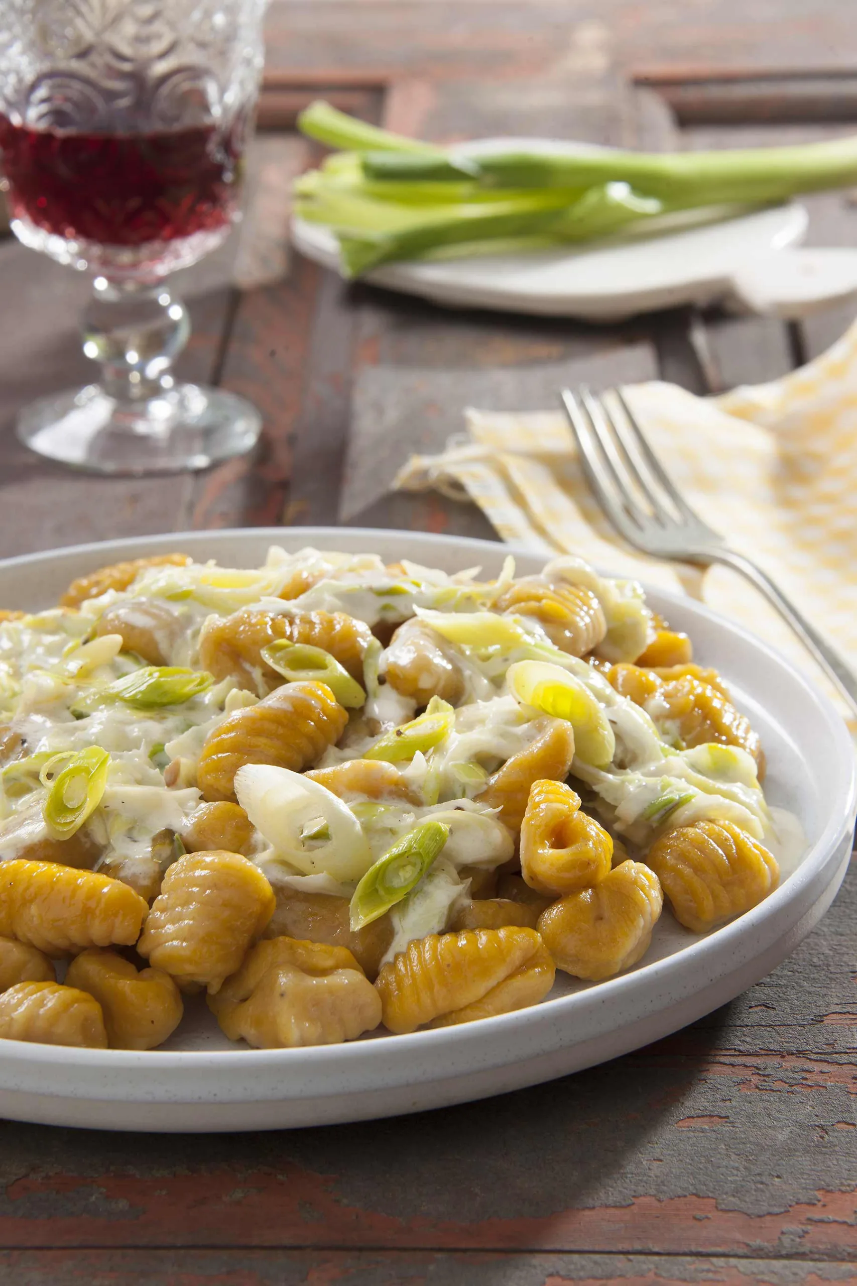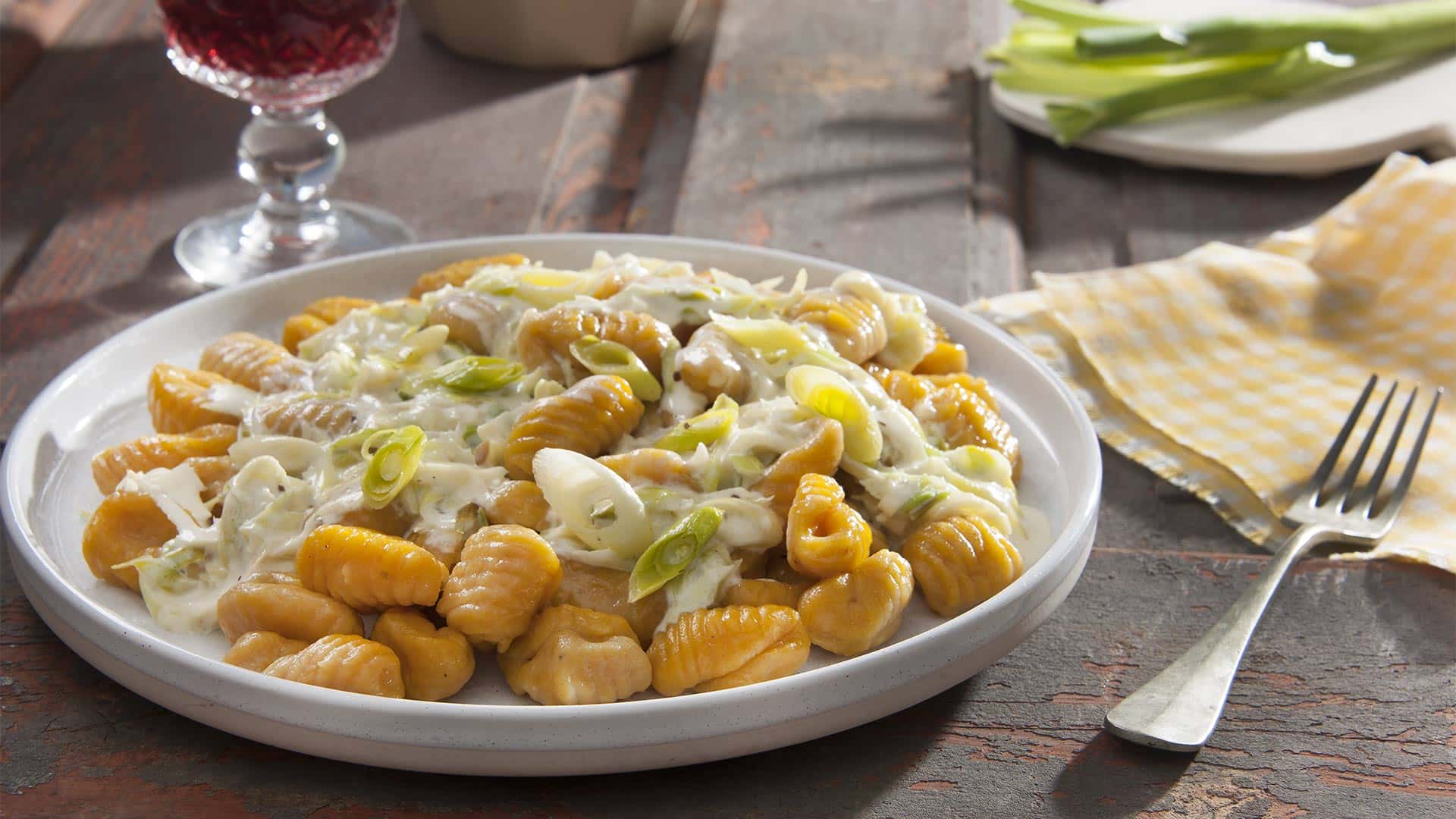 Volcar los ñoquis cocidos en la salsa, sartenear y servir.