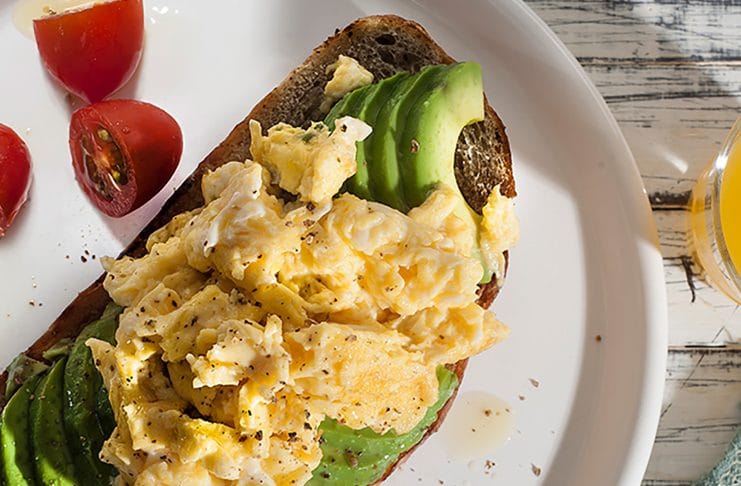 Cortar la palta en lรกminas y ubicar sobre la tostada tibia. Poner los huevos revueltos encima y terminar con un chorrito de aceite de oliva.