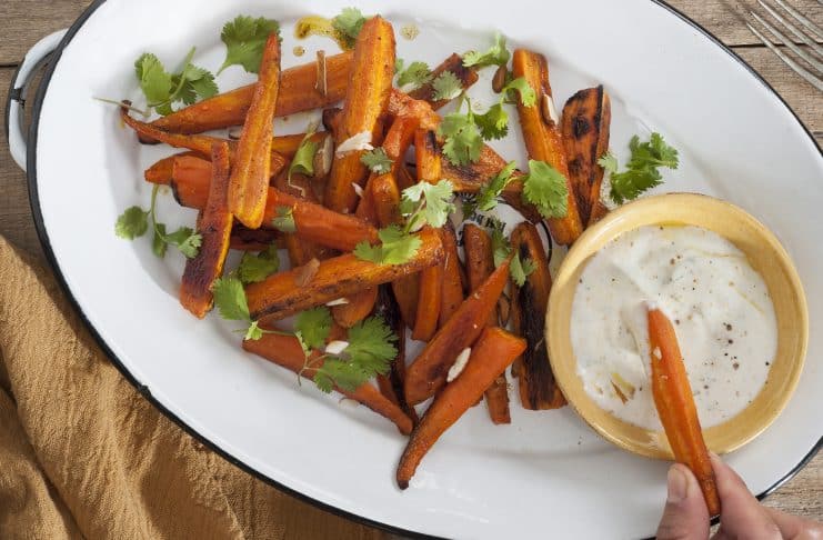 Para hacer aderezo de yogurt: asar los dientes de ajo en el horno envueltos en papel aluminio (podemos ponerlos junto con las zanahorias en la fuente). Una vez tiernos, procesar o mixear con el yogurt, el curry, el jugo de limรณn, el aceite, sal y pimienta.