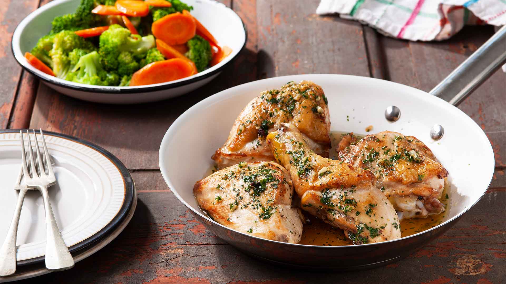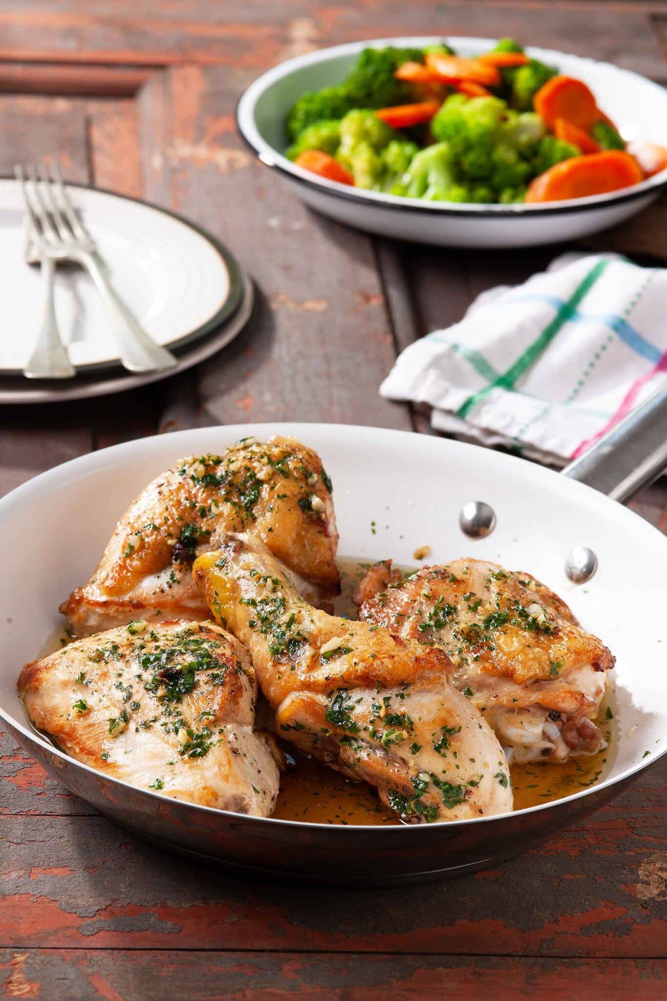Volver a poner los ajos y sumar el caldo hasta cubrir el pollo. Tapar y cocinar por unos 20 minutos más.