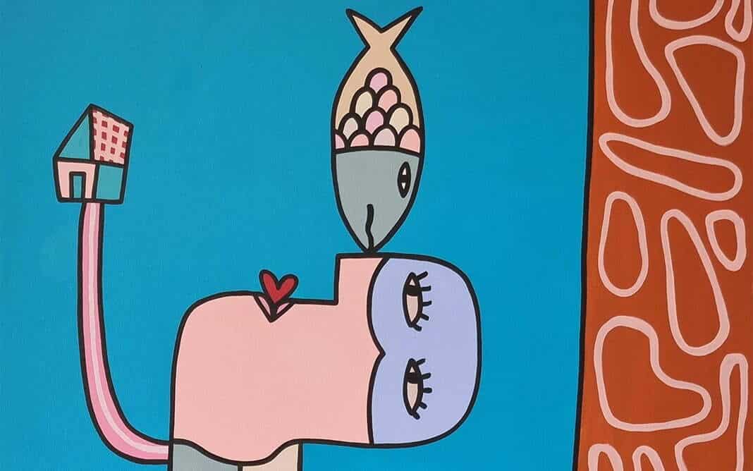 Pero volvamos al dibujo. Hay una casa, la casa tiene una puerta y a la puerta se llega por un camino. ยฟEse camino es el que llega o el que se abre a la inmensidad de cada uno? Los brazos tambiรฉn pueden ser caminos. El personaje que se levanta erguido y firme sobre sus zapatos, dominando la escena, inclina su cabeza para poder mirar amorosamente a un pez a los ojos. El pez, presumiblemente amigo, hace equilibrio boca abajo mostrando sus vistosas escamas y dibujando con su cola la letra โVโ de vida, o jugando con la segunda โVโ de Convivimos.