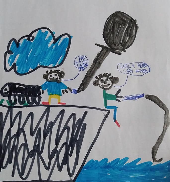 “En el dibujo estoy con mi hermano Santino, que tiene 5 años. Sé pescar, siempre voy con él y mis papás. Me gusta mucho leer libros y también dibujar. Voy a primer grado y me gusta escribir”.