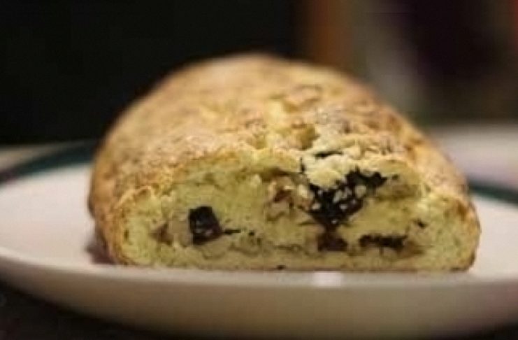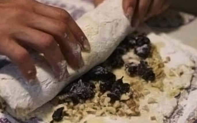 Extender la masa en forma de rectángulo, con un espesor de 1,5 cm aproximadamente, sobre una superficie enharinada. Colocar encima de la masa las nueces y las ciruelas, ambas bien picadas. Añadir una fina capa de azúcar. Enrollar la masa y formar un pan con las manos, uniendo bien los bordes para cerrar el pan. Pintar con las claras y espolvorear con azúcar.