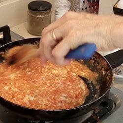 Como ya les comentรฉ antes, los tomates deben ser maduros; para hacerlos al estilo de Malvina se cortan al medio y se rallan, son preferibles los tomates redondos. En una sartรฉn se calienta un poquito de aceite, el que mรกs les guste, mi mamรก usaba el de siempre, aceite Cocinero (el de la botella de vidrio con tapita de metal), yo prefiero de olivaโฆ Dorar un diente de ajo entero cuidando que no se queme, porque se pone amargo el aceite. Echamos el purรฉ de tomates y dejamos que se evapore un poco el jugo de los tomates, revolviendo cada tanto. Luego, y dependiendo tambiรฉn del purรฉ que queda, ponemos huevos y revolvemos hasta cuajar.