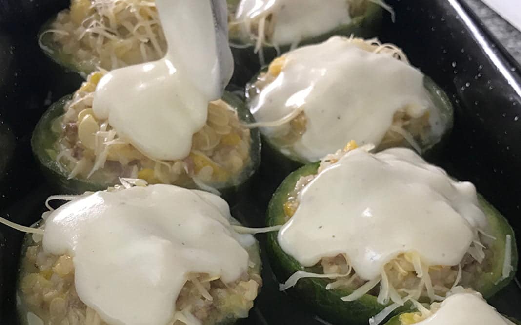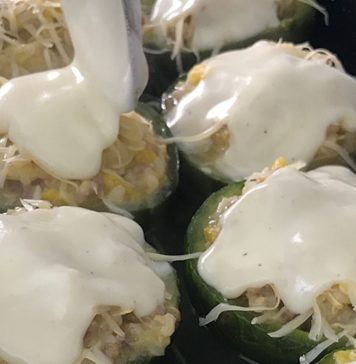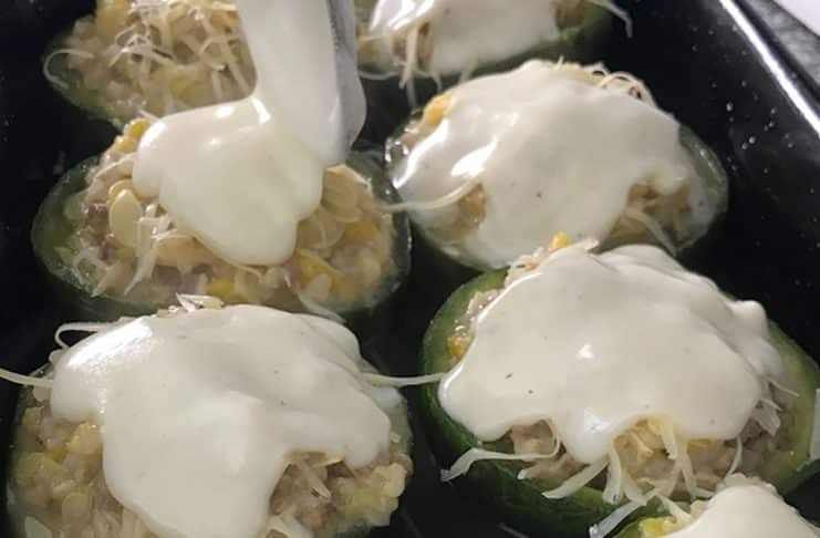Disponer los zapallitos en una asadera, rellenarlos con la mezcla y cubrir con salsa blanca y el queso rallado.