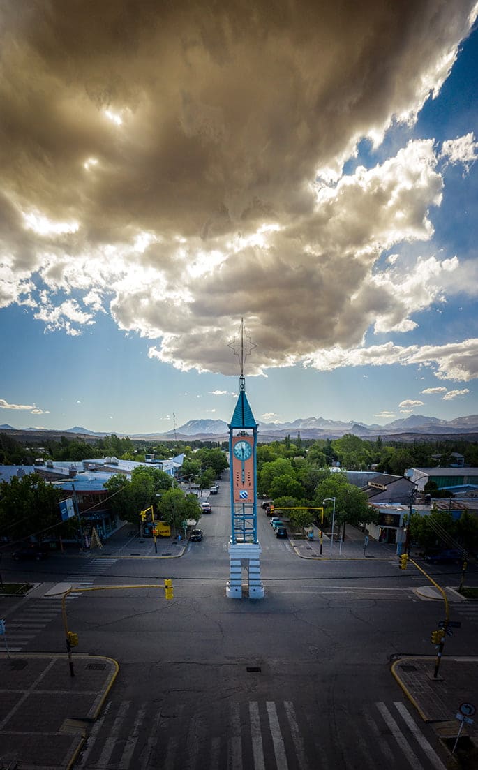 Otra vez la emblemรกtica y espectacular ruta 40. Apenas se zambulle en la ciudad de Malargรผe, se convierte en la avenida San Martรญn y la atraviesa por la mitad. Va cambiando su fisonomรญa de asfalto agrietado y acumula una circulaciรณn paralela, aun cuando transita buena parte por el borde del Aeropuerto Comodoro Ricardo Salomรณn, hasta inmiscuirse en la parte mรกs urbana y llegar hasta la esquina de Julio Argentino Roca: justamente allรญ se levanta la emblemรกtica Torre del Cincuentenario, conocida como โEl Relojโ. Con sus 15 metros de altura, con su base de columnas de cemento y su cuerpo en hierro, fue inaugurada el 16 de noviembre de 2000, y del reloj surge una melodรญa cada 15 minutos.