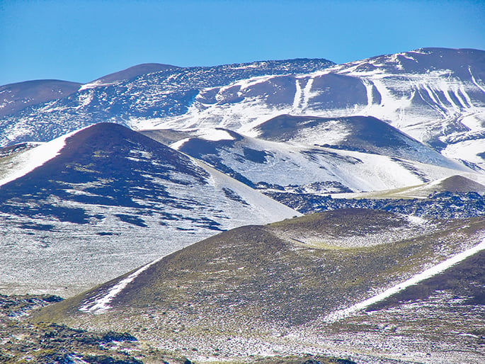 Pero, ademรกs, recorriendo solo 150 kilรณmetros se llega a Payunia, sobre la precordillera. Son unas 450.000 hectรกreas que muestran las huellas que dejaron millones de aรฑos de volcanes, que transformaron la zona en un gran desierto negro. Es fantรกstico el contraste que se advierte con el colorido del horizonte cordillerano. En esta zona exclusiva (solo superada por la penรญnsula rusa de Kamchatka, el lugar en el mundo de mayor concentraciรณn de volcanes) hay 10 volcanes cada 100 kilรณmetros cuadrados: se llevan registrados 800 conos volcรกnicos, pero se sospecha que debe haber muchos mรกs. Se originรณ durante el Cenozoico, por lo que sus derrames de lava mรกs recientes datan de hace 40.000 aรฑos. El sitio, que fue postulado para convertirse en Patrimonio de la Humanidad, tiene imรกgenes que siempre sorprenderรกn.