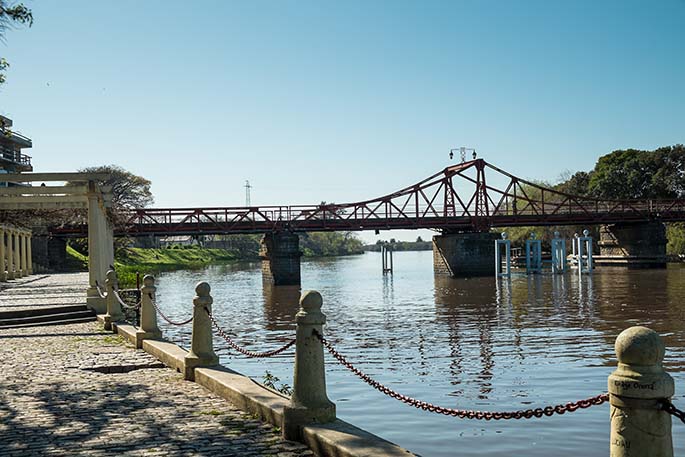La ciudad tiene la virtud de saber mixturar lo antiguo y lo moderno, lo apacible y el confort de los mejores sitios. Su emblema es un puente rojo giratorio sobre el arroyo de las Vacas. Lo llaman Golden Gate por su color y es un รญcono. Casi una postal de Carmelo. Un antiguo slogan dice: โQuien cruza este puente regresa, siempre regresaโ. Construido en 1912 por una empresa alemana, tiene la cualidad de ser giratorio (mediante unas grandes manivelas) para permitir el paso de embarcaciones grandes. Del viejo puente aรบn se ven las bases de madera semisumergidas en el arroyo. Desemboca en la romรกntica Rambla de los Constituyentes, que lleva al puerto y su atractiva Fuente de las Tentaciones. Junto al puente se encuentra el emblemรกtico Carmelo Rowling Club.