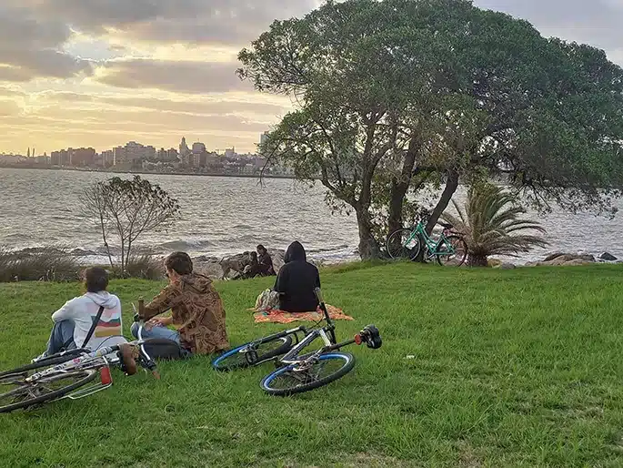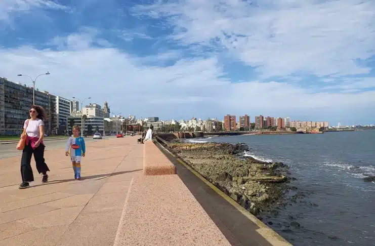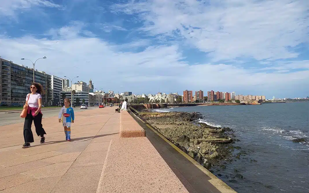 En los bancos de madera del centro una pareja feliz sella la conversaciรณn con un beso. En la zona de playas de arena hay redes de vรณley y se arman los picaditos de fรบtbol. El morro del Parque Rodรณ se adivina por el enjambre de reposeras. Cerca del faro de Pocitos aparecen los monopatines elรฉctricos y los pibes en skate. Rumbo a un bar de la playa de Carrasco va un grupo que parece reciรฉn salido del secundario, cada uno con su propio termo bajo el brazo.