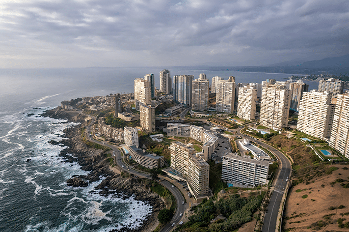 Y a ocho kilómetros, por la avenida España, bordeando el imponente océano Pacífico, se puede llegar a Valparaíso, el principal puerto del país. Una hermosa contraposición: la portentosa infraestructura urbana y la insuperable villa impecablemente equipada para el turismo. La combinación exacta que lo convierte en un destino muy visitado durante todo el año por los turistas. Con la Cordillera de la Costa que aparece como una tromba por el litoral, emergiendo del verde profundo de la flora y construyendo un paisaje fantástico que se zambulle en el mar para mezclarse perfectamente con el azul del mar y del cielo.